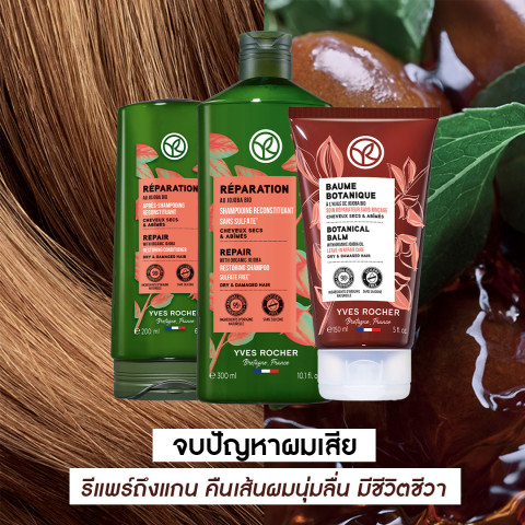 [แพ็คคู่] Yves Rocher Reparation Shampoo 300 มล. & Conditioner 200 มล. เซ็ตดูแลผมเสียแบบครบขั้นตอนในคู่เดียว ช่วยฟื้นบำรุงล้ำลึก “รีแพร์ถึงแกน” ลดความแห้งกรอบและความหยาบกระด้างที่ทำให้ผมชี้ฟู คืนผมนุ่มลื่น มีน้ำหนัก ดูมีชีวิตชีวา เหมาะสำหรับผมที่ผ่านการทำเคมี ความร้อน หรือเผชิญมลภาวะและการจัดทรงเป็นประจำ ในราคา 489.00 บาท คุ้มค่า ใช้ได้ยาวนาน