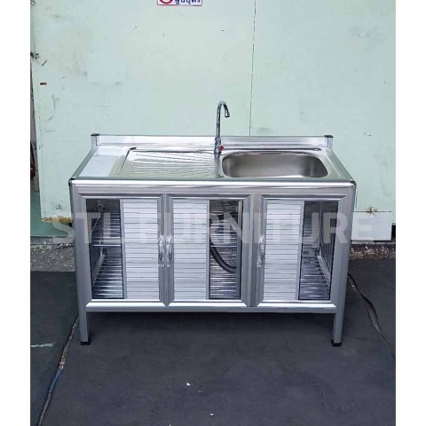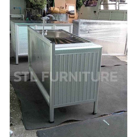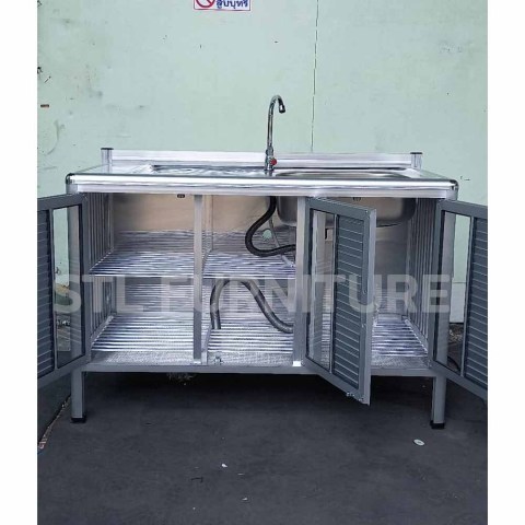 มาพร้อมอ่างล้างจานสแตนเลสขนาดใช้งานสบาย ติดตั้งในตำแหน่งด้านซ้ายของตัวตู้ พร้อมแผงกันตกด้านหลังสูง 5 ซม. ช่วยป้องกันน้ำกระเด็นเลอะผนังด้านหลังได้เป็นอย่างดี ความสูงจากพื้นถึงอ่าง 80 ซม. และความสูงรวมทั้งตู้ 85 ซม. ออกแบบให้รองรับสรีระการยืนล้างจาน ลดอาการเมื่อยล้าเมื่อต้องใช้งานเป็นเวลานาน