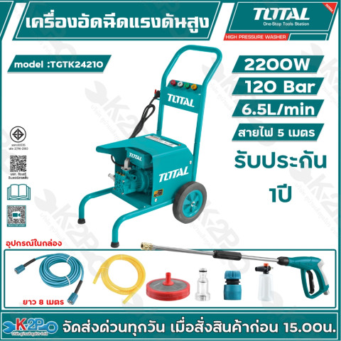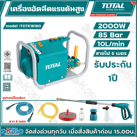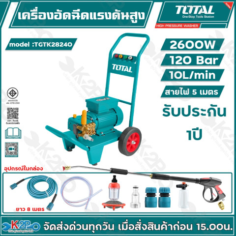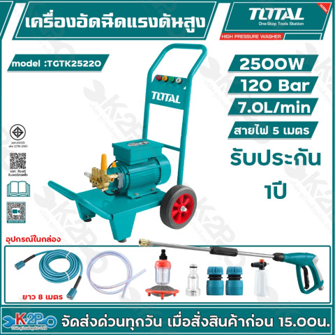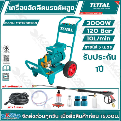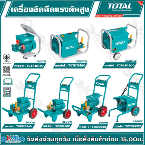 TOTAL เครื่องอัดฉีดน้ำแรงดันสูง รุ่น TGTK16160, TGTK18180, TGTK20200, TGTK25220, TGTK28240 และ TGTK30280 คือชุดเครื่องฉีดน้ำแรงดันสูงสำหรับงานทำความสะอาดรอบบ้านและงานเอนกประสงค์ ใช้งานได้ทั้งฉีดล้างรถ ล้างแอร์ ล้างพื้น ล้างโรงรถ ผนัง และพื้นผิวต่าง ๆ ช่วยประหยัดเวลา แรง และน้ำ ให้คุณจัดการคราบหนักได้อย่างง่ายดายด้วยแรงดันน้ำเต็มบาร์ตามรุ่น พร้อมมอเตอร์กำลังสูง ใช้ไฟบ้าน 220V ได้ทันที ไม่ยุ่งยาก
