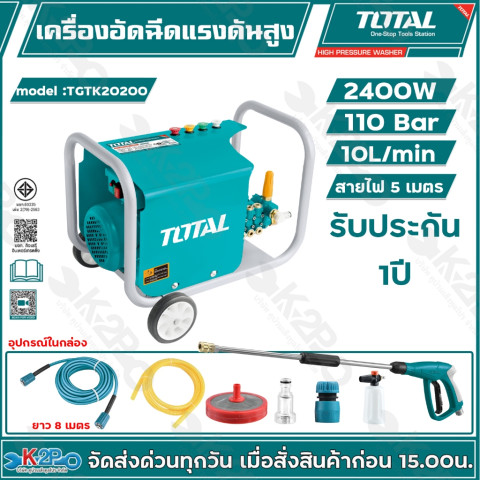 เพิ่มกำลังมอเตอร์เป็น 2000 วัตต์และแรงดัน 85 บาร์ เหมาะสำหรับผู้ที่ต้องการพลังฉีดแรงขึ้น ใช้งานล้างรถหลายคัน ล้างแอร์บ่อย ๆ หรือทำความสะอาดพื้นและผนังที่มีคราบแน่น อัตราการไหลของน้ำประมาณ 10 ลิตรต่อนาที ให้แรงปะทะต่อเนื่องและรวดเร็วรุ่น TGTK20200 – 110 บาร์เต็ม / 2400 วัตต์