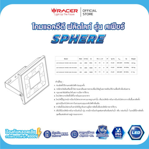 Racer LED FLOODLIGHT SPHERE 200W แสงขาว คือโคมฟลัดไลท์ที่ตอบโจทย์ทั้งความสว่าง ทนทาน และความปลอดภัย เหมาะสำหรับผู้ที่ต้องการโคมไฟภายนอกกำลังสูง ดีไซน์สวย ทันสมัย ใช้งานได้ยาวนานคุ้มค่าทุกการลงทุน
