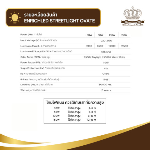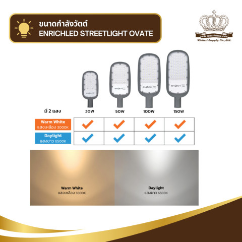 หากคุณกำลังมองหาโคมไฟถนน LED ที่ทั้งสว่าง ทนทาน ประหยัดไฟ และปลอดภัย โคมไฟถนน LED ENRICH รุ่น OVATE พร้อมกิ่งยึด คือคำตอบที่ครบจบในตัวเดียว เลือกกำลังไฟและโทนแสงให้เหมาะกับพื้นที่ของคุณ แล้วกดสั่งซื้อได้ทันที
