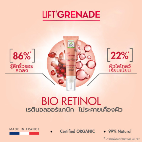 ค้นพบผิวเรียบเนียนโกลว์ราวผิวเด็กกับ SO'BiO étic Lift Grenade Intense Serum (SB-045) เซรั่มเรตินอลธรรมชาติสูตรอ่อนโยนที่รวมพลัง Bio Retinol จากพืชออร์แกนิก และ สารสกัดทับทิมออร์แกนิก เพื่อการลดเลือนริ้วรอยอย่างมีประสิทธิภาพ โดยไม่ทำให้ผิวระคายเคือง เหมาะสำหรับแม้ผิวบอบบางแพ้ง่าย