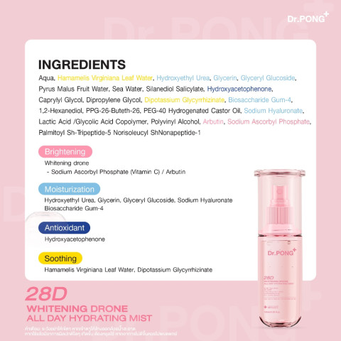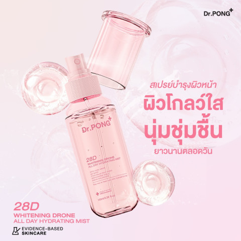 Dr.PONG 28D Whitening Drone All Day Hydrating Mist สเปรย์บูสต์ผิวสูตรไวท์เทนนิ่งโดรนที่คัดสรรส่วนประกอบทรงพลังเพื่อปลอบประโลม เติมความชุ่มชื้น และเผยผิวกระจ่างใสตลอดวัน เนื้อสเปรย์บางเบา กระจายตัวละเอียด ช่วยลดความแห้งกร้านและปกป้องผิวจากมลภาวะพร้อมให้ความสดชื่นทันทีที่ใช้ เหมาะสำหรับทุกสภาพผิว พกพาง่าย ใช้ได้ทุกช่วงเวลาที่ต้องการฟื้นบำรุง