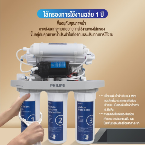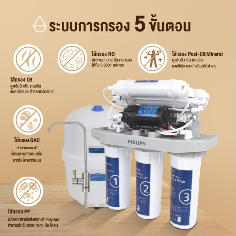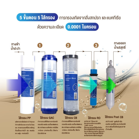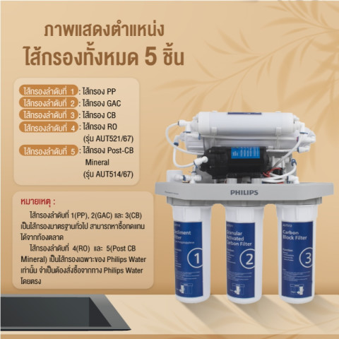 หมายเหตุ: ไส้กรองขั้นที่ 1–3 สามารถซื้อทดแทนได้ทั่วไป ส่วนไส้กรอง RO (ขั้นที่ 4) และ Post-CB (ขั้นที่ 5) ต้องใช้ของแท้จาก Philips Water เท่านั้น เพื่อคงประสิทธิภาพและมาตรฐานความปลอดภัย