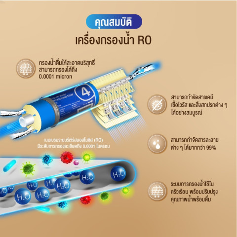 ด้วยเมมเบรนระบบ RO ที่กรองละเอียดได้ถึง 0.0001 ไมครอน คุณจึงมั่นใจได้ว่าน้ำดื่มที่ได้ผ่านการกำจัดสิ่งปนเปื้อนอย่างมีประสิทธิภาพ ไม่ว่าจะเป็นไวรัส แบคทีเรีย โลหะหนัก สารกำจัดศัตรูพืช สารอินทรีย์ระเหยง่าย คลอรีน ความกระด้าง และสิ่งสกปรกอื่น ๆ ทำให้น้ำสะอาด ปลอดภัย และมีรสชาติดี เหมาะสำหรับดื่มและประกอบอาหารทุกวัน