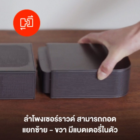 ลำโพงยิงเสียงขึ้นด้านบน (Up-firing) ช่วยสร้างความสูงของเวทีเสียง ให้เอฟเฟกต์พุ่งผ่านเหนือศีรษะ สมจริงยิ่งขึ้นลำโพงเซอร์ราวด์ถอดแยกได้