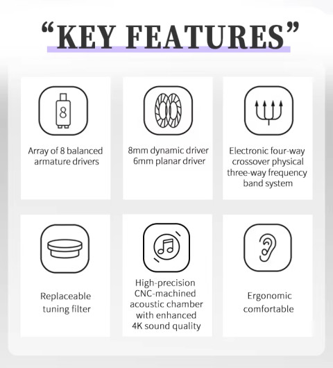 ไดรเวอร์: ไฮบริดรวม 10 ไดรเวอร์ (8 Balanced Armature + 2 Dynamic)