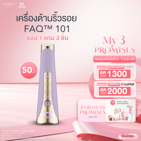 FOREO FAQ 101 Anti-aging Device Amethyst เครื่องต้านริ้วรอยพลังโปร ที่รวมเทคโนโลยีดูแลผิวระดับคลินิกไว้ในเครื่องเดียว ให้คุณทำทรีทเม้นท์ยกกระชับ–ลดเลือนริ้วรอยได้เองที่บ้านอย่างปลอดภัยและมีประสิทธิภาพ เห็นผิวดูสว่าง กระชับ และเรียบเนียนขึ้นภายใน 10 นาที