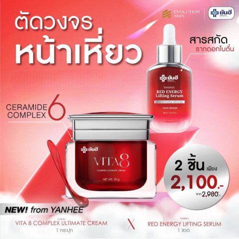 YANHEE VITA8 COMPLEX ULTIMATE CREAM [ เรด + ไวต้าเอจ ] ครีมบำรุงผิวหน้าสูตรเข้มข้นจากทีมวิจัยโรงพยาบาลยันฮี ออกแบบมาเพื่อดูแลปัญหาผิววัย 40+ โดยเฉพาะ ช่วยลดเลือนริ้วรอย ความหย่อนคล้อย และจุดด่างดำ ด้วยนวัตกรรม “ย้อนวัยผิวแบบทา” ที่พัฒนาให้เนื้อครีมซึมซาบลึก พร้อมฟื้นบำรุงให้ผิวดูแน่น กระชับ อิ่มฟู และแข็งแรงขึ้นอย่างเป็นธรรมชาติ