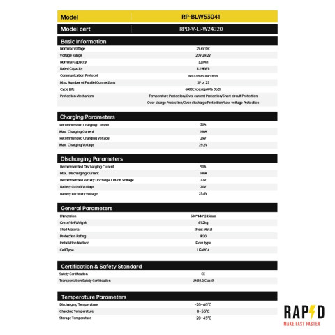 RAPD LiFePO4 Battery 24V 320Ah (Floor Type) รุ่น RPD-V-Li-W24320 แบตเตอรี่ลิเธียมฟอสเฟตสำหรับระบบโซล่าเซลล์ ให้พลังงานสำรองขนาดใหญ่ ใช้งานได้เสถียร เหมาะสำหรับบ้านพักอาศัย ร้านค้า หรือระบบสำรองไฟที่ต้องการความจุสูงในรูปแบบตั้งพื้น ติดตั้งง่าย พร้อม ฟรีค่าส่ง คุ้มค่าทั้งประสิทธิภาพและความสะดวกในการจัดส่ง