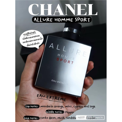 ✨ป้ายไทย✨ Chanel Allure Homme Sport Eau Extreme น้ำหอมผู้ชายโทน Fresh Creamy Powdery ที่ให้ความรู้สึกเรียบหรู สะอาด ดูแพงแบบเข้าใจง่าย เปิดกลิ่นสดชื่นแนวซิตรัสโทนส้ม (ไม่ใช่เบอร์กามอต) ก่อนตามด้วยความหวานนวลละมุน พอเซ็ตตัวจะกลายเป็นความหวานวานิลลาแป้งๆ แบบเบาสบาย ไม่หนัก ไม่เวียนหัว เหมาะทั้งวันทำงาน ออกไปเที่ยว หรือวันเดท