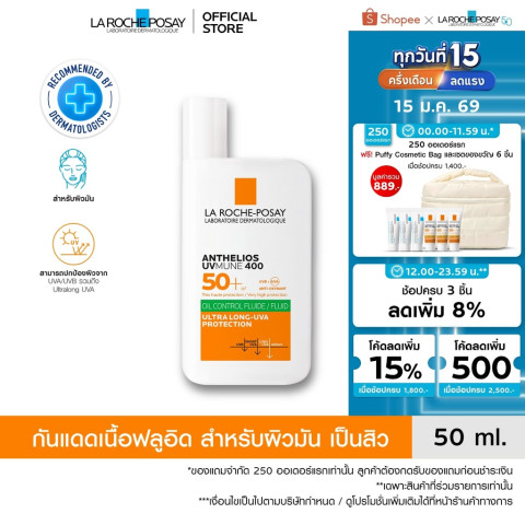 ลา โรช-โพเซย์ La Roche-Posay Anthelios UVMUNE400 Oil Control Fluid SPF50+ PA++++ 50ml กันแดดเนื้อฟลูอิดสำหรับผิวมัน ที่มอบการปกป้องผิวประสิทธิภาพสูง พร้อมช่วยคุมมันให้ผิวดูแมทท์สบายตลอดวัน ในขวดเดียวจบทั้งเรื่องแดดและความมัน