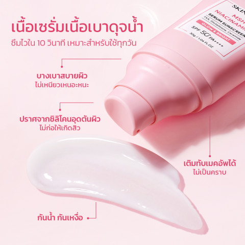 SKINTIFIC MSH Niacinamide Brightening Serum Sunscreen กันแดดหน้าเนื้อเซรั่มที่ผสานการบำรุงและการปกป้องผิวในขั้นตอนเดียว ช่วยให้ผิวดูกระจ่างใสขึ้น พร้อมสร้างเกราะป้องกันผิวจากแสงแดดและมลภาวะ เหมาะสำหรับใช้ทุกวัน เนื้อบางเบา ซึมไวภายใน 10 วินาที ไม่เหนอะหนะ ให้ผิวเรียบเนียนสบายผิว