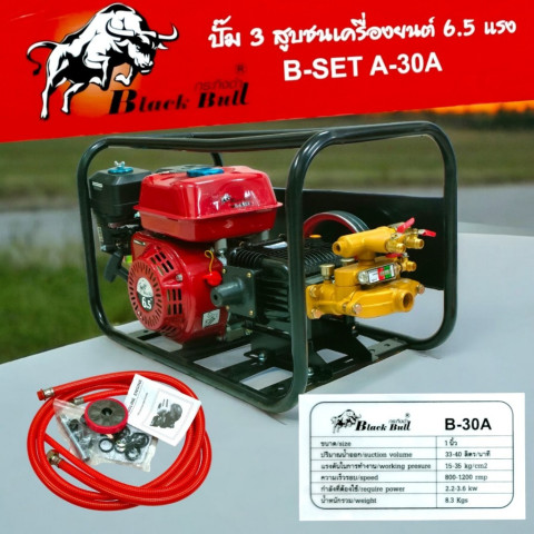BLACK BULL ปั๊มพ่นยา 3 สูบ 1 นิ้ว B-SET A-30A พร้อมเครื่องยนต์อเนกประสงค์ 6.5 แรงม้า (01-4529) ชุดปั๊มพ่นยาพร้อมใช้จากกระทิงดำ ออกแบบมาเพื่อการพ่นยา/พ่นน้ำที่ต้องการแรงดันดี ฉีดได้สูงและไกล เหมาะกับงานเกษตร งานสวน และงานพ่นล้างในพื้นที่กว้าง มาพร้อมเครื่องยนต์ 4 จังหวะ สตาร์ทง่าย ใช้งานคล่อง พร้อมอุปกรณ์ครบชุด ช่วยประหยัดเวลาในการติดตั้งและเริ่มงานได้ทันที