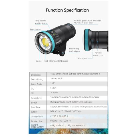 ไฮไลต์คือ Strobe Mode ที่ดันความสว่างได้สูงสุด 6000 ลูเมน เพิ่มมิติให้ภาพและความสนุกในการถ่ายใต้น้ำมากขึ้น ตัวบอดี้ออกแบบให้ ทนถึก ใช้งานง่าย ขนาดกะทัดรัด มาพร้อมระบบซีล O-ring 2 ชั้น รองรับการดำน้ำลึกได้ถึง 100 เมตร มั่นใจได้ทุกทริป