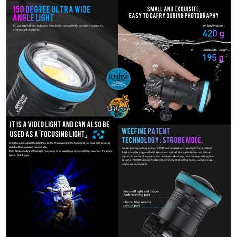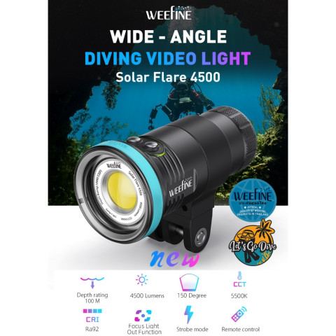 Weefine Solar Flare 4500 (SF4500) รุ่น WF102 ไฟถ่ายภาพใต้น้ำแบบ Video Light ที่ให้ความสว่างจัดเต็มถึง 4500 ลูเมน พร้อมมุมแสงกว้าง 150° เก็บสีสันโลกใต้น้ำได้สวยเป็นธรรมชาติด้วยอุณหภูมิสี 5500K และค่า CRI Ra92+ เหมาะทั้งถ่ายวิดีโอและภาพนิ่งแบบมือโปรในไฟดวงเดียว