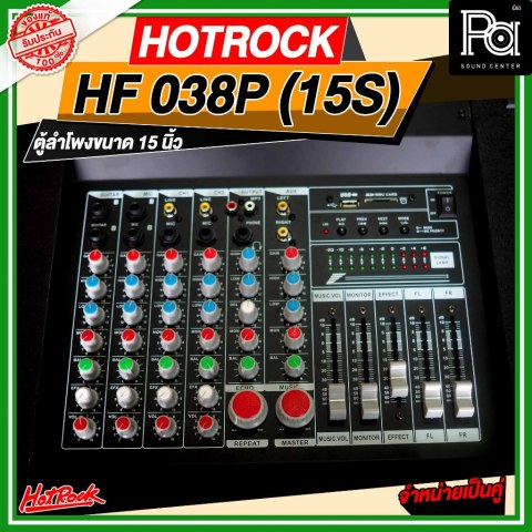 HOTROCK HF 038P (15S) ชุดตู้ลำโพงมีแอมป์ในตัวแบบพร้อมใช้ สำหรับงานเสียงที่ต้องการพลังและความสะดวกในเซ็ตเดียว ได้ลำโพงขนาด 15 นิ้ว จำนวน 2 ใบ (1 คู่) ให้เสียงแน่น เบสกระชับ กระจายเสียงได้ดี เหมาะทั้งงานอีเวนต์ขนาดย่อม งานพูด/พรีเซนต์ เปิดเพลงในร้าน หรือใช้งานภายในอาคารและกิจกรรมกลางแจ้ง