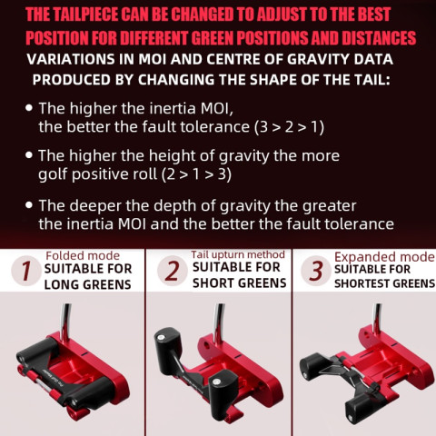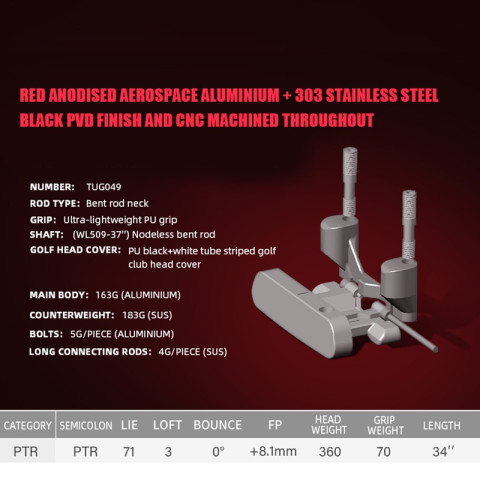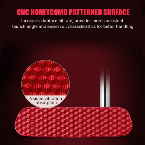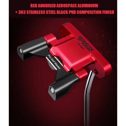โครงหัวพัตเตอร์ใช้ อะลูมิเนียมอโนไดซ์สีแดง ผสาน สแตนเลส 303 เคลือบ PVD สีดำ เพิ่มความทนทานและลุคสปอร์ตหรู พร้อมงาน CNC เพื่อความเที่ยงตรงของรูปทรงและผิวสัมผัสปรับสมดุลให้เข้ากับระยะและสภาพกรีน