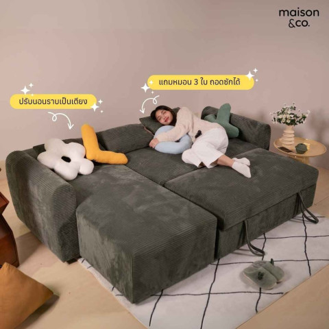 SB Design Square โซฟาเบดมุมซ้าย BUTTER PLUS สีเขียว จากแบรนด์ MAISON&CO. ดีไซน์โซฟาเข้ามุมที่ตอบโจทย์ทั้งนั่งพักผ่อนและปรับเป็นเตียงนอนขนาดใหญ่ในตัว เหมาะสำหรับคอนโด บ้านพื้นที่จำกัด หรือมุมรับแขกที่อยากได้ฟังก์ชันครบในชิ้นเดียว หุ้มผ้าทั้งตัวให้สัมผัสนุ่มฟู โทนสีเขียวช่วยเติมความสดชื่นให้ห้องดูมีชีวิตชีวา พร้อมดูแลทำความสะอาดง่าย
