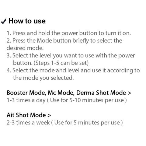 Booster / MC / Derma Shot: วันละ 1-3 ครั้ง ครั้งละ 5-10 นาที