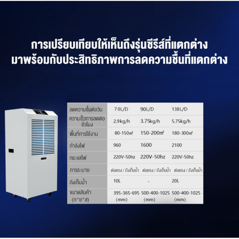เครื่องดูดความชื้น Commercial Dehumidifier (70-158L) ตัวช่วยลดความชื้นสำหรับบ้านและธุรกิจ ให้บรรยากาศแห้งสบาย ลดกลิ่นอับ ช่วยปกป้องเฟอร์นิเจอร์ เอกสาร สินค้าในสต็อก และอุปกรณ์ต่างๆ จากความชื้นสะสม พร้อมดีไซน์ที่เหมาะกับการใช้งานต่อเนื่อง ประหยัดพลังงาน และเสียงการทำงานเบา เหมาะทั้งโกดัง ร้านค้า ออฟฟิศ ห้องเก็บของ และพื้นที่กว้าง