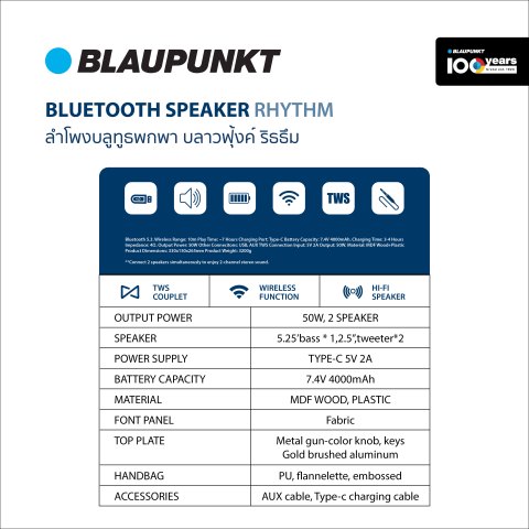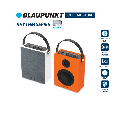 BLAUPUNKT ลำโพงบลูทูธพกพา 50 วัตต์ รุ่น RHYTHM ดีไซน์คลาสสิคโทน ORANGE & WHITE เติมบรรยากาศให้ทุกพื้นที่ พร้อมพลังเสียงเต็มอารมณ์จากกำลังขับ 50W และลำโพงคู่ ให้เสียงแน่น ชัด ฟังเพลินทั้งเพลงโปรด พอดแคสต์ หรือดูหนังที่บ้านก็เอาอยู่