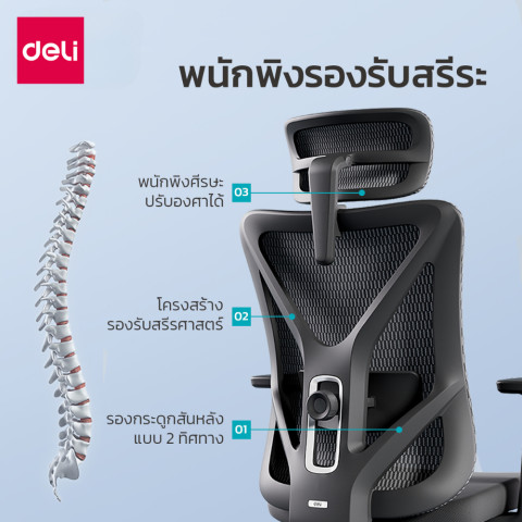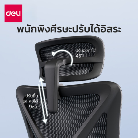 Deli เก้าอี้ออฟฟิศ/เก้าอี้ทำงาน ดีไซน์ตามหลักสรีระ นั่งสบาย ระบายอากาศดีด้วยวัสดุตาข่าย (Mesh) พร้อมฟังก์ชันปรับเอน 90–135° ล็อกได้ เหมาะทั้งทำงานยาวๆ และเอนพักผ่อนระหว่างวัน รองรับน้ำหนักได้สูงสุด 150 กก. ให้คุณนั่งมั่นคงและสบายในทุกวันทำงาน