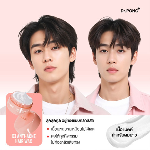Dr.PONG ANTI-ACNE HAIR WAX (X3 เนื้อแมตต์) แว็กซ์เซตผมสูตรลดสิวและลดความมันบนหนังศีรษะ ช่วยจัดทรงให้ดูดีแบบเป็นธรรมชาติ พร้อมดูแลสภาพหนังศีรษะให้สบาย ลดโอกาสเกิดการระคายเคืองด้วยสูตร ปราศจากน้ำหอมและพาราเบน เหมาะสำหรับคนที่มีปัญหาหนังศีรษะมัน เป็นสิวง่าย หรืออยากได้แว็กซ์ที่อยู่ทรงแต่ไม่หนักผม