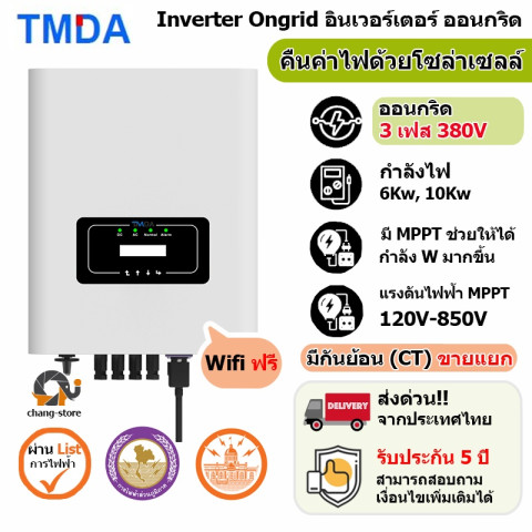 อินเวอเตอร์ On Grid 3 เฟส TMDA รุ่น TMDA-SUN-6k-G03 / TMDA-SUN-10k-G03 สำหรับระบบโซล่าเซลล์แบบกริดไทล์ (Grid-Tie) ช่วยแปลงไฟจากแผงโซลาร์ให้ใช้งานร่วมกับไฟบ้าน/โรงงานได้อย่างมีประสิทธิภาพ มาพร้อมฟังก์ชันสำคัญอย่าง Zero Export ป้องกันไฟที่ผลิตได้ไหลย้อนเข้าระบบการไฟฟ้า เหมาะทั้งงานติดตั้งใหม่และอัปเกรดระบบเดิม พร้อม รับประกัน 5 ปี และบริการดูแลหลังการขายที่ไว้ใจได้