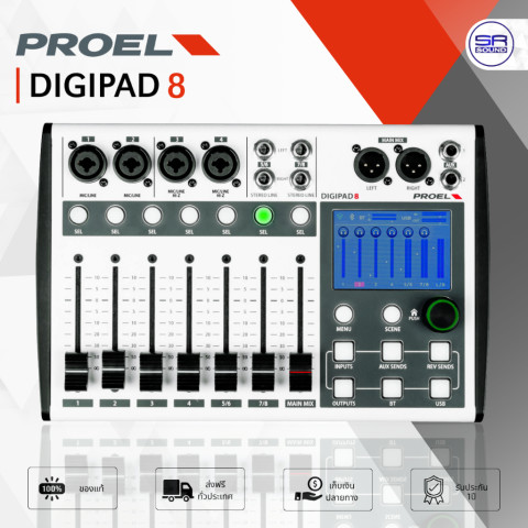 PROEL DIGIPAD8 Digital Mixer ดิจิตอลมิกเซอร์อัจฉริยะขนาดพกพา 8 แชนแนล ที่อัดแน่นฟีเจอร์ระดับคอนโซลรุ่นใหญ่ไว้ในตัวเดียว โดดเด่นด้วย Motorized Faders (เฟดเดอร์ไฟฟ้า) 60 มม. และ หน้าจอสัมผัสสี 3 นิ้ว ช่วยให้ควบคุมมิกซ์ได้แม่นยำ รวดเร็ว และดูเป็นมืออาชีพ ไม่ว่าจะใช้งานบนเวที สตรีมมิง หรือในโฮมสตูดิโอ พร้อม Wi‑Fi ในตัว สำหรับควบคุมแบบไร้สาย และ Bluetooth 5.2 สำหรับเปิดเพลง/แบ็กกิ้งแทร็กได้สะดวกทันที