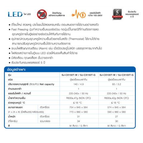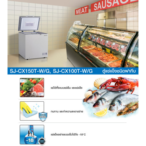 ตู้แช่แข็งฝาทึบ Sharp รุ่น SJ-CX150T-W ขนาด 4.9 คิว ดีไซน์ใหม่สวยหรู ใช้งานคุ้มทั้งบ้าน ร้านค้า และสต๊อกอาหาร ด้วยความจุ 140 ลิตร (4.9Q) แช่ได้จุใจ พร้อมฟังก์ชันเร่งความเย็นและระบบเตือน ช่วยให้แช่ของได้มั่นใจยิ่งขึ้น ในราคา 5,661.90 บาท