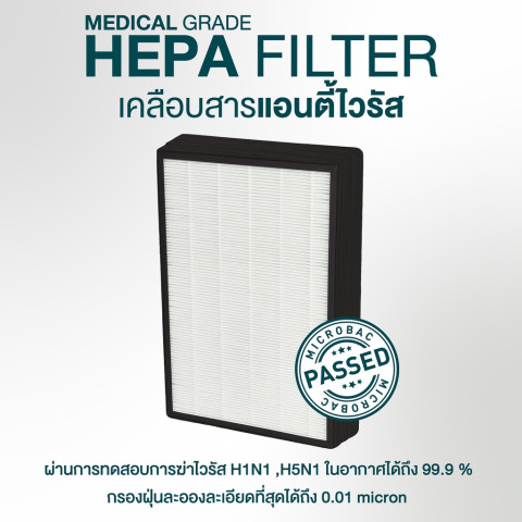 Double Anti-bacteria Medical Grade HEPA Filter ประสิทธิภาพสูง กรองอนุภาคเล็กมากได้ถึง 0.01 ไมครอน และกรองได้ 99.97% พร้อมประสิทธิภาพฆ่าเชื้อ 99.9%