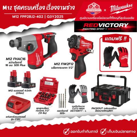 Milwaukee - M12 ชุดครบเครื่อง เรื่องงานช่าง รหัส M12 FPP2BJ2-402 | Q3Y2025 คือเซ็ตเครื่องมือไร้สายที่รวมงานเจาะคอนกรีตแบบ SDS Plus และงานขัน-คลายน็อตแรงบิดสูงไว้ในชุดเดียว พร้อมแบตเตอรี่ 4.0Ah จำนวน 2 ก้อน แท่นชาร์จ และกล่อง PACKOUT ขนาดใหญ่ จัดเก็บง่าย พกไปหน้างานสะดวก เหมาะทั้งช่างมืออาชีพและงานซ่อมบำรุงที่ต้องการความคล่องตัวของระบบ M12