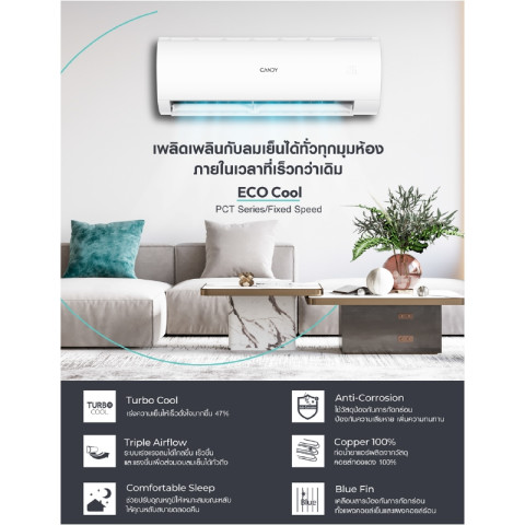 เย็นไวทันใจด้วยโหมด Turbo Cool เร่งความเย็นได้มากขึ้นถึง 47% พร้อมระบบ Triple Airflow กระจายลมเย็นได้ไกลขึ้น แรงขึ้น และทั่วถึงทุกมุมห้อง โดยลมไม่ปะทะตัวตรงๆ เพิ่มความสบายตลอดวัน เหมาะสำหรับบ้าน คอนโด หรือออฟฟิศที่ต้องการแอร์ Fixed Speed ใช้งานง่าย คุ้มค่า และได้มาตรฐานความปลอดภัย