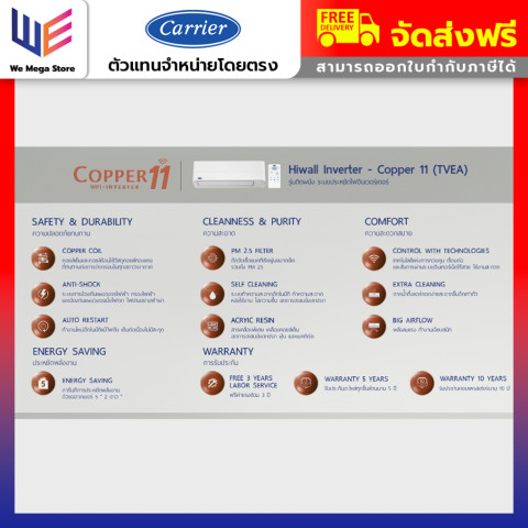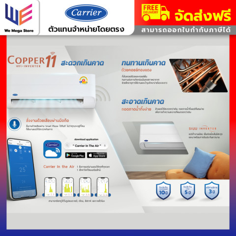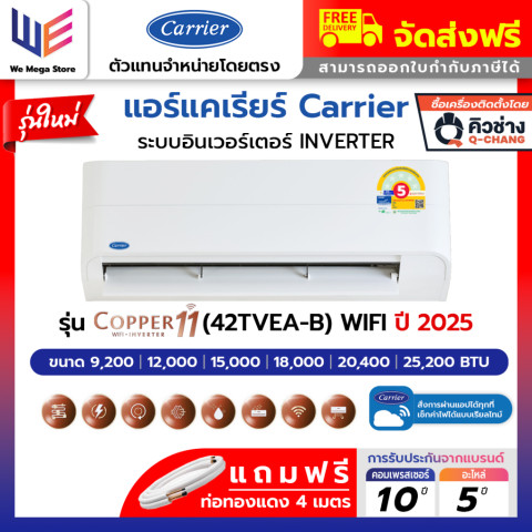 ใหม่ แอร์แคเรียร์ Carrier ระบบอินเวอร์เตอร์ (Inverter) รุ่น Copper 11 (TVEA-B) WIFI ปี 2025 ประหยัดไฟเบอร์ 5 ควบคุมผ่านแอปได้ พร้อมฟิลเตอร์ดักจับฝุ่น PM2.5 เหมาะสำหรับบ้านพักอาศัย และหน่วยงานขนาดเล็ก-กลาง