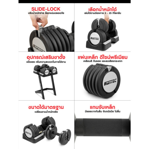 ปรับน้ำหนักได้ตั้งแต่ 5 / 6 / 7 / 9 / 10 / 11 / 13 / 15 / 18 / 19 / 20 / 23 / 24 / 25 กิโลกรัม เพียงชุดเดียวสามารถรองรับโปรแกรมฝึกได้หลากหลาย ทั้งเวทสำหรับผู้เริ่มต้น การเพิ่มกล้ามเนื้อ ไปจนถึงการฝึกแบบหนักสำหรับคนที่ต้องการพัฒนาศักยภาพสูงสุดเทคโนโลยี SLIDE TEC + ระบบ Slide-Lock ปลอดภัยสูง