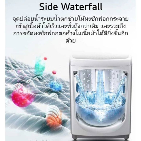 Side Waterfall ระบบจ่ายน้ำแบบน้ำตกด้านข้าง ช่วยให้ผงซักฟอกและน้ำยาซักผ้าละลายและกระจายเข้าสู่เนื้อผ้าได้รวดเร็วและทั่วถึง ลดปัญหาคราบผงซักฟอกตกค้าง