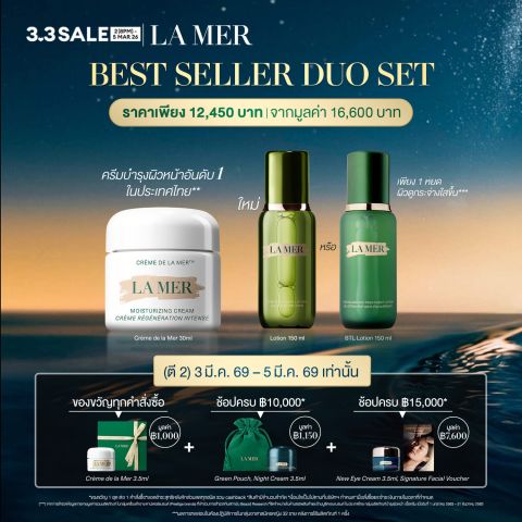 ค้นพบผิวสวยเปล่งประกายระดับลักซ์ชัวรี่ด้วย [8pm 2 Mar 26 - 5 Mar 26 Exclusive Set] La Mer - 2pcs Skincare Set with Moisturizer 30ml & The New Balancing Treatment Lotion 150ml (worth ฿16,600) • Bestseller Duo เซ็ตบำรุงผิวยอดนิยมจาก La Mer ที่คัดสรร 2 ไอเทมขายดี มอบสมดุลและความชุ่มชื้นล้ำลึกให้ผิวอย่างครบขั้นตอน เหมาะสำหรับผู้ที่ต้องการยกระดับสกินแคร์รูทีนสู่มาตรฐานสปาระดับไฮเอนด์ที่บ้าน