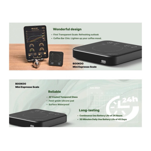 เครื่องชั่งขนาดเล็ก ดีไซน์โปร่งใสโดดเด่น พร้อมหน้าจอแสดง อัตราการไหล และความสามารถเชื่อมต่อแอปเพื่อข้อมูลการสกัดแบบละเอียด เหมาะสำหรับวางบนถาดรองน้ำของเครื่องเอสเปรสโซส่วนใหญ่ และพกพาง่าย