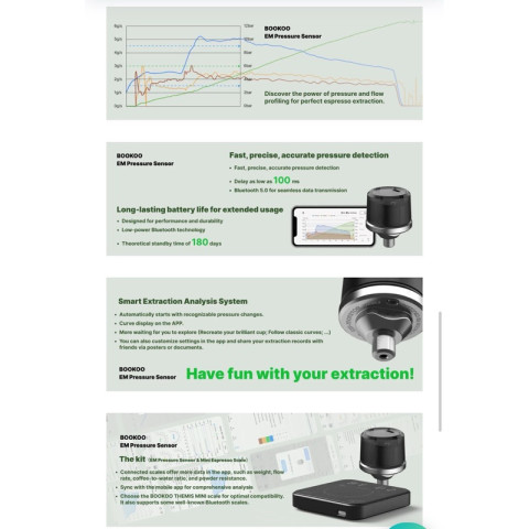 ยกระดับการชงเอสเปรสโซให้ “คุมได้ทุกช็อต” ด้วยชุดอุปกรณ์วัดการสกัดจาก BooKoo ที่รวม เซ็นเซอร์วัดแรงดัน และ เครื่องชั่งเอสเปรสโซขนาดเล็ก ช่วยให้คุณเห็นทั้งแรงดัน น้ำหนัก และอัตราการไหลแบบเรียลไทม์ผ่านแอป เพื่อปรับสูตรได้แม่นยำ ทำซ้ำช็อตที่อร่อยได้ง่ายขึ้น และวิเคราะห์ปัญหาการไหล/การแทมป์/การบดได้ตรงจุด