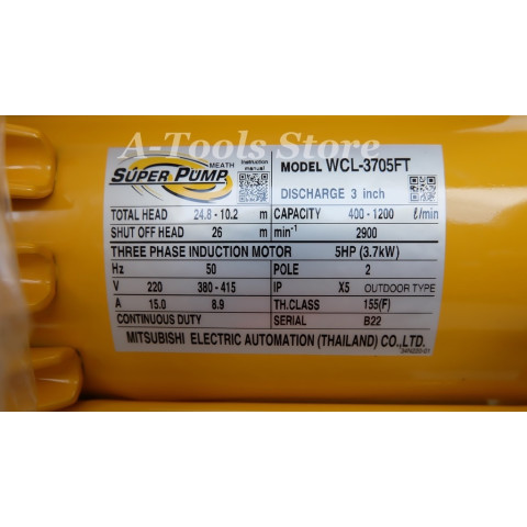 MITSUBISHI SUPER PUMP รุ่น WCL-3705FT ปั๊มน้ำหอยโข่งชนิดปริมาณน้ำมาก (Large Flow Centrifugal Pump) แบบหน้าแปลน ขนาดท่อ 3" x 3" กำลัง 5 แรงม้า ใช้ไฟ 380V เหมาะสำหรับงานสูบน้ำที่ต้องการปริมาณมากและทำงานต่อเนื่อง ทั้งภาคการเกษตร อุตสาหกรรม และงานระบบประปา