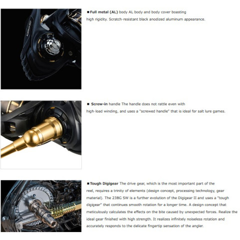 จุดเด่นของซีรีส์ BG SW คือ “ทน-แรง-ไว้ใจได้” ตัวบอดี้โลหะทั้งตัว (อลูมิเนียม) ผสานเกียร์ดิจิตอลขนาดใหญ่และด้ามจับแบบขันเกลียว ให้แรงบิดดี หมุนมั่นใจเวลาปลาวิ่งหรือยกเหยื่อหนัก เหมาะกับงานทะเลที่เจอสภาพโหดและแรงกระชากจัดๆ