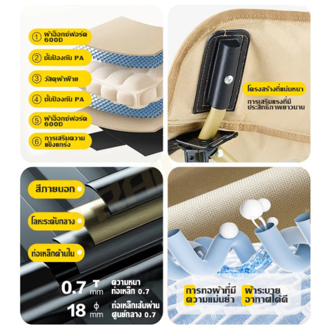 มาพร้อมโครงสร้างท่ออลูมิเนียมหนาพิเศษ น้ำหนักเบาแต่แข็งแรง รองรับน้ำหนักได้สูงสุดถึง 300 กิโลกรัม ให้คุณนั่งได้อย่างมั่นใจไม่โยกไม่ยวบ ตัวผ้าทำจากผ้าอ๊อกฟอร์ดหนา 2 ชั้น 600D ระบายอากาศดีเยี่ยม ทนต่อการเสียดสีและรอยขีดข่วน เหมาะกับการใช้งานกลางแจ้งระยะยาว พับเก็บและกางได้ในไม่กี่วินาที มาพร้อมถุงจัดเก็บ พกพาสะดวกไม่เปลืองพื้นที่ในรถหรือในบ้าน