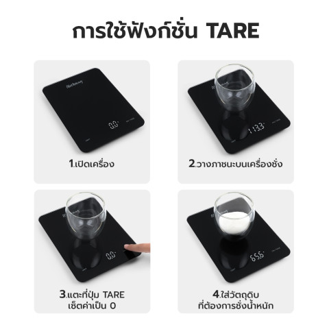 วางภาชนะบนเครื่องชั่ง จากนั้นกดปุ่ม Tare/รีเซ็ต เพื่อให้ค่ากลับเป็นศูนย์