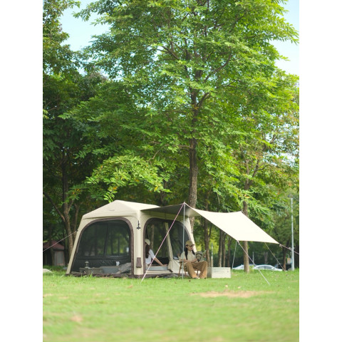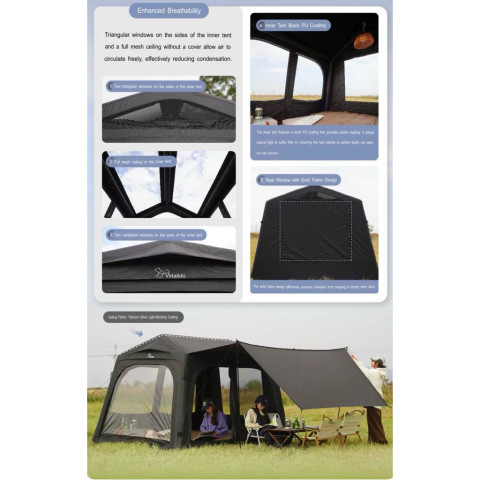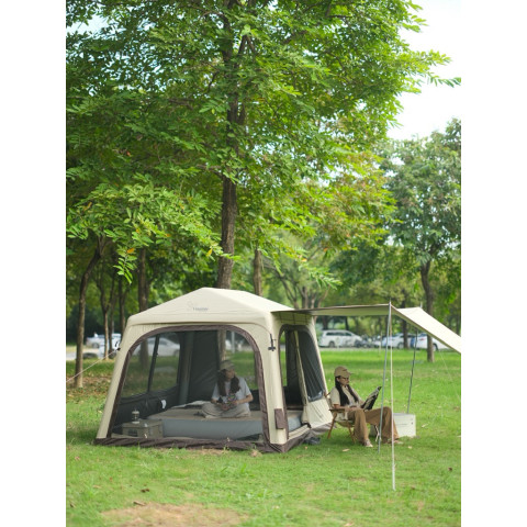 ตัวเต็นท์ใช้วัสดุเกรดพรีเมียม กันแดด กันฝน และทนทานต่อสภาพอากาศ พร้อมหน้าต่างระบายอากาศรอบทิศทาง ทำให้ภายในโปร่งโล่ง ไม่อับชื้น เหมาะสำหรับทริปแคมป์ปิ้งแบบครอบครัว แก๊งเพื่อน หรือคู่รักที่ต้องการพื้นที่กว้างขวางและเป็นส่วนตัว