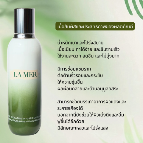 La Mer The Hydrating Infused Emulsion 125ml อิมัลชั่นบำรุงผิวหน้าเนื้อบางเบาสไตล์ลักชัวรี ช่วยเติมน้ำให้ผิวทันทีตั้งแต่ครั้งแรกที่ใช้ พร้อมมอบงานผิว ชุ่มชื้นฉ่ำโกลว์ ดูอิ่มฟู เรียบเนียน และสุขภาพดี ด้วยพลังบำรุงจาก Miracle Broth™ เอกลักษณ์ของ La Mer เหมาะสำหรับทุกสภาพผิว โดยเฉพาะผู้ที่มีปัญหาผิวแห้ง ผิวขาดน้ำ หรือผิวแห้งตึงระหว่างวัน