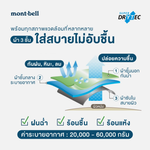 กันน้ำและระบายอากาศดีเยี่ยม ด้วยผ้า 3 ชั้น SUPER DRY-TEC ลิขสิทธิ์เฉพาะของ Montbell ช่วยรับมือหิมะ ลม และสภาพอากาศแปรปรวน
