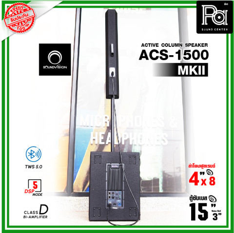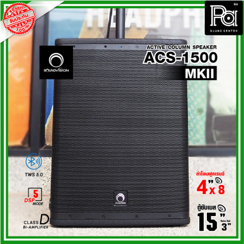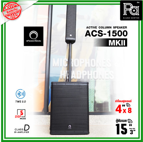 Soundvision ACS 1500 MKII ชุดตู้ลำโพง Active คอลัมน์ระดับงานอีเวนต์/งานพรีเซนต์ ที่ให้พลังเสียงครบย่านด้วยคอลัมน์ไลน์อาเรย์ 8×4 นิ้ว และซับวูฟเฟอร์ 15 นิ้ว พร้อมแอมป์ Class D แบบ Bi-Amp และ DSP ในตัว เลือกโหมดเสียงได้ตามรูปแบบงาน เสริมความสะดวกด้วย Bluetooth 5.0 และรองรับ TWS สำหรับเชื่อมต่อแบบไร้สายเป็นสเตอริโอ เหมาะทั้งงานดนตรีสด ดีเจ งานพูด/สัมมนา คาเฟ่ ร้านอาหาร ไปจนถึงงานกลางแจ้งขนาดย่อม