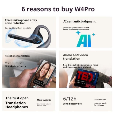 Timekettle W4 Pro AI Interpreter Earbuds หูฟังแปลภาษาอัจฉริยะสำหรับมืออาชีพ ที่ออกแบบมาเพื่อ “การสื่อสารแบบหันหน้าเข้าหากัน” ในออฟฟิศ งานประชุม และการทำธุรกิจข้ามประเทศ แปลพร้อมกันแบบสองทิศทางด้วยเทคโนโลยีสิทธิบัตรของ Timekettle ช่วยให้คุยกับชาวต่างชาติได้ลื่นไหล เหมือนมีล่ามส่วนตัวอยู่ข้างหู